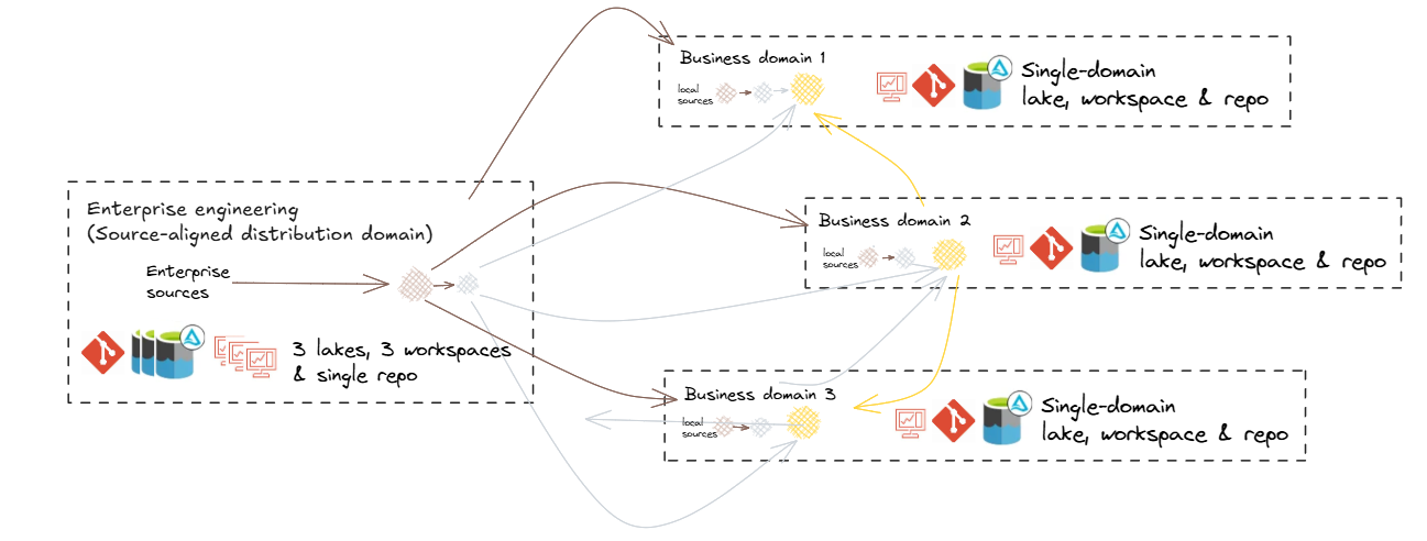 Hybrid federated mesh topology reflects a common scenario whereby centralisation occurs upstream for improved consolidation and standardisation around engineering, while federation occurs downstream for improved analytical flexibility and responsiveness.